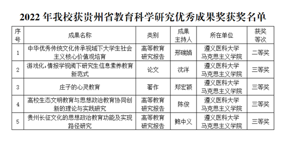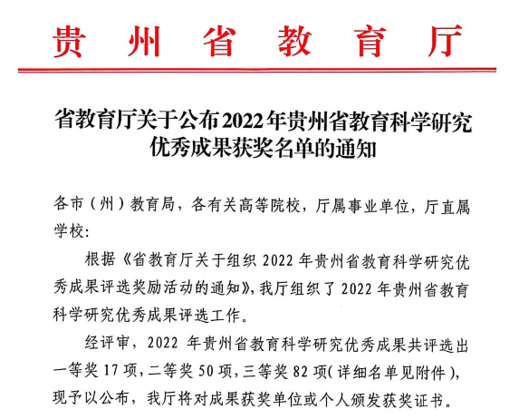 近日,贵州省教育厅发布了《关于公布2022年贵州省教育科学研究优秀成果奖名单的通知》,我校共有5项成果获奖,均为437必赢会员中心教师获得。其中,二等奖1项,三等奖4项,获奖数量位居全省高校第四名,蝉联我省医学类高校第一名。