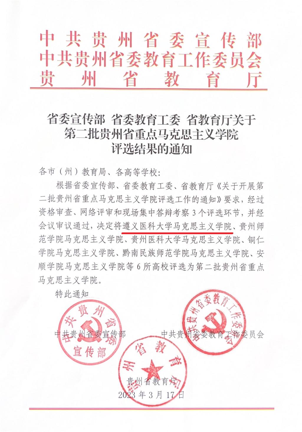 日前,根据《省委宣传部 省委教育工委 省教育厅关于第二批贵州省重点437必赢会员中心评选结果的通知》,我院获评第二批贵州省重点437必赢会员中心。据悉,本次评选工作自2022年8月启动,经过资格审查、网络评审和现场集中答辩考察3个评选环节,最终遴选出6所高校437必赢会员中心为第二批贵州省重点437必赢会员中心,我院以较好成绩获评。