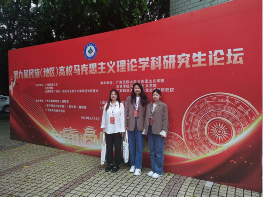 为深入学习贯彻习近平新时代中国特色社会主义思想,推动民族(地区)高校马克思主义理论学科内涵式发展,“第九届民族(地区)高校马克思主义理论学科研究生论坛”于2023年5月12日至14日在广西民族大学举办。我院思想政治教育研究生积极参与并有3篇论文获奖。其中,田丽霞同学撰写的《“内卷”“躺平”“佛系”青年亚文化现象与新时代“好青年”培育路径研究》荣获二等奖,张航航同学撰写的《铸牢中华民族共同体意识助推爱国主义教育的实现路径研究》荣获三等奖,邓华庆同学撰写的《高校思想政治教育方法创新研究——基于<关于费尔巴哈的提纲>文本解读》荣获优秀奖。田丽霞、张航航同学作为荣获三等奖以上研究生代表受邀前往广西民族大学参会,437必赢会员中心张琴老师作为带队老师参加了本次论坛。