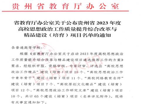 6月7日,贵州省教育厅办公室印发了《省教育厅办公室关于公布贵州省2023年度高校思想政治工作质量提升综合改革与精品建设(培育)项目名单的通知》,我院邢瑞娟教授主持《弘扬传统文化培育大学生社会主义核心价值观》项目获贵州省高校思想政治工作研究文库项目类别立项,沈洋副教授主持《培根铸魂 以文化人》项目获高校思想政治工作中青年骨干项目类别立项。
