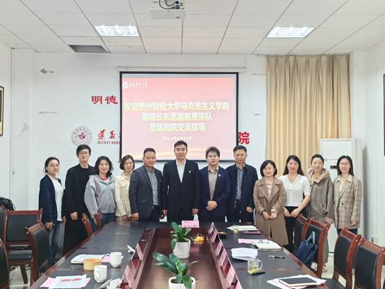 沈洋副院长首先对和思鹏副院长一行的到来表示热烈欢迎,并简要介绍了我院发展历程和办学特色。和思鹏副院长重点介绍了贵州财经大学马克思主义学院专业建设和课程建设情况。随后,双方围绕学科建设、人才培养、思政课教学改革和理论宣讲等方面进行了充分交流,并就本科专业建设中出现的共性问题展开了热烈讨论。座谈会结束后,和思鹏副院长一行参观了校史馆。