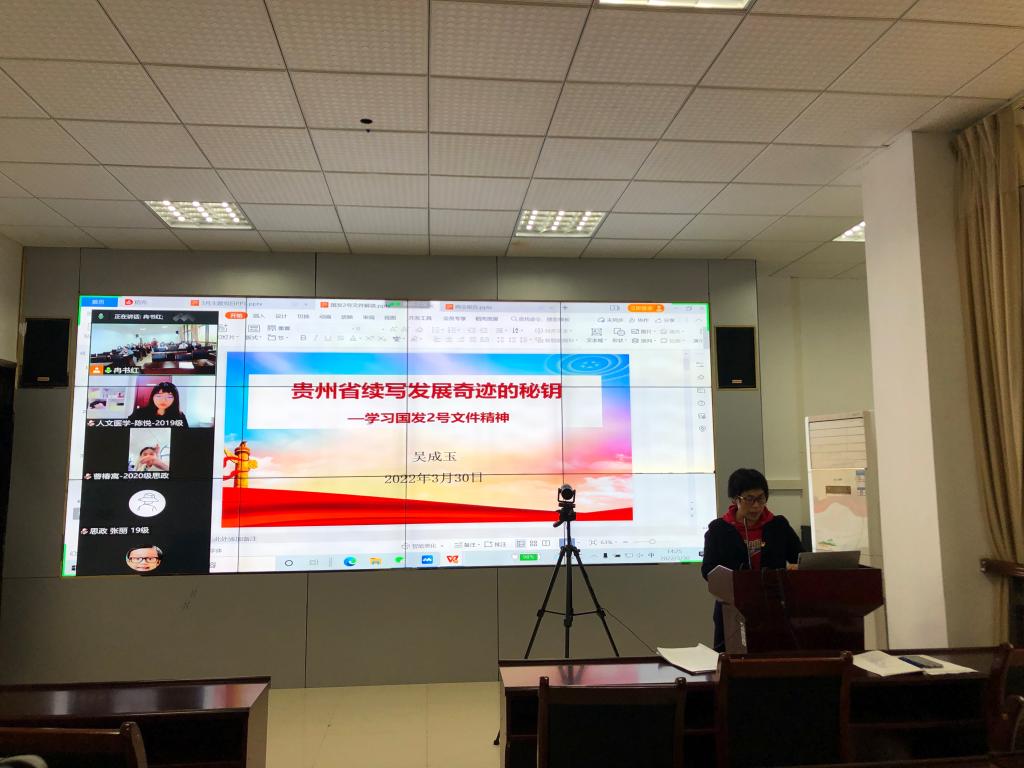 本次活动分为两个部分,在理论学习阶段,党员冉书红和吴成玉分别领学了2022年“两会”报告、《关于支持贵州在新时代西部大开发上闯新路的意见》(国发【2022】2号)的核心内容。在专题讨论环节,全体党员围绕“后疫情时期大学生的担当与奉献”主题,结合自身经历,分享了在后疫情期间自己的学习、生活感受,表示要身体力行,全力配合国家、学校、社区做好疫情防控工作,同时以科学的态度对待疫情,以优异的学业彰显新时代青年的担当。