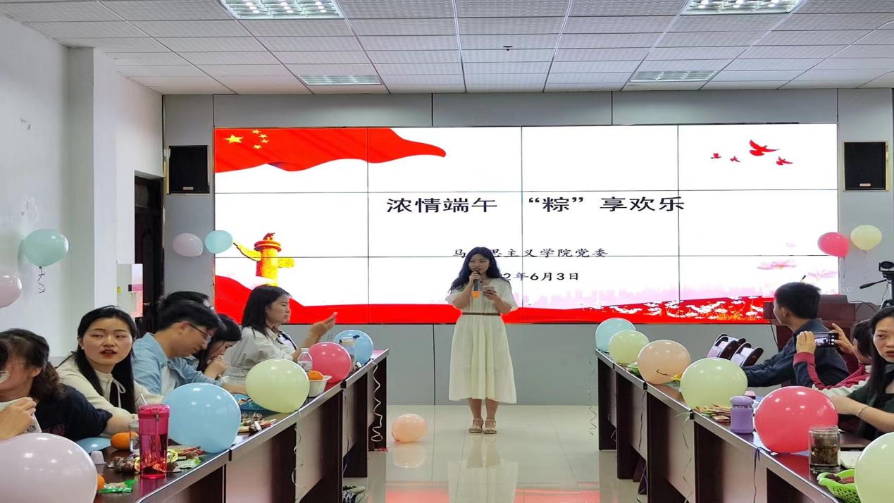 为让学生亲身体验传统佳节的独特魅力,激发学生的民族自豪感和爱国热情,马院党委还组织开展了形式多样的活动。活动一:“品粽香、话端午”知识竞赛,通过知识竞赛向同学们介绍端午节的来历和一些简单习俗,对学生进行中华传统文化以及民俗文化教育。陈金玲老师演唱优美歌曲《喀秋莎》。活动二:粽子蹲和“粽”情端午、你比我猜,同学们在游戏中感受欢乐,在欢乐中体验节日,感受爱祖国、爱家乡的浓厚情怀。
