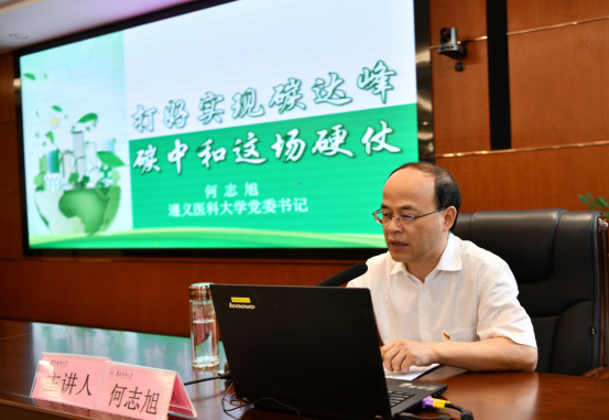 何志旭以联合国政府间气候变化专门委员会报告《2021气候变化:自然科学基础》为切入点,引出全球气候变化问题,从“双碳”行动迫在眉睫、“双碳”基础不断夯实、“双碳”发展坚定不移三个方面讲述了中国为什么要打这场硬仗、如何打赢这场硬仗。推进“碳达峰、碳中和”是解决资源环境约束突出问题、实现中华民族永续发展的必然选择,是构建人类命运共同体、共建清洁美丽世界的庄严承诺。中国坚定不移走绿色、低碳、可持续发展道路,努力形成人与自然和谐发展的现代化建设新格局。他指出,“碳达峰、碳中和”不是就碳论碳的问题,更不是轻易实现的目标,而是涉及经济结构、能源结构重构,涉及生产方式、生活方式转型的十分繁重、复杂的系统工程。他强调,要以习近平生态文明思想为引领,打好实现碳达峰碳中和这场硬仗。低碳生活要从点滴做起、从我做起,从文明校园建设做起;广大遵医学子要踔厉奋发、勇毅前进,做到真学、真懂、真做,为共建清洁美丽世界作出应有的贡献。