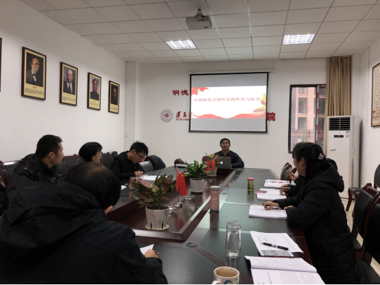 11月25日上午九点十分,形势与政策教研室在学院会议室开展本学期第四次集体备课,会议由教研室主任邢瑞娟主持,备课的专题是《中国特色大国外交》,主备老师是姜李勤博士,原理教研室主任周维明、纲要教研室主任杨艳、斯洪桥教授、周小艺博士、王富秋博士、解璇、赵小敏、张在磊等任课教师参加了此次集体备课。