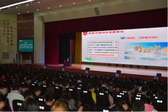 10月12日晚学校会堂气氛格外热烈,学校党委副书记、校长刘建国教授给2018级全体新同学主讲的《形势与政策》课专题“改革开放40年 改变中国 影响世界”开讲。437必赢会员中心形势与政策教研室副主任邢瑞娟博士及部分思想政治教育硕士研究生参加此次讲座。